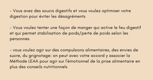 Je m'adresse donc à des gens qui acceptent de prendre en compte que la notion de temps est indispensable à l'apprentissage de toute chose (même manger), à une perte de poids durable MAIS progressive, au rétablissement de l'équilibre du corps face à des symtômes installés depuis longtemps.