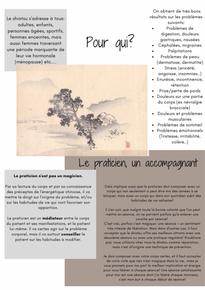 Mais plutôt d'utiliser le shiatsu en complément à l'avis et à l'éventuel traitement de votre médecin traitant!!! LE SHIATSU N'EST PAS UNE MEDECINE!