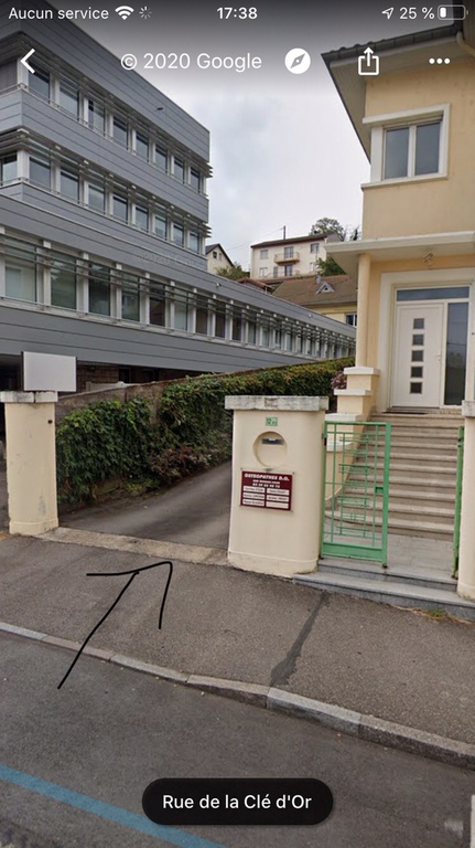 Par la rue de la Clé d'Or, à côté de la CPAM, au fond du parking situé derrière le bâtiment des ostéopathes Caroline STEIN et cie, porte violette sous porche